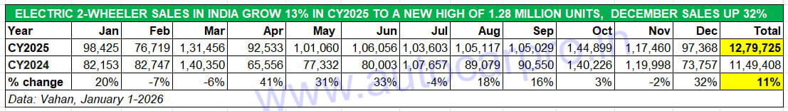 If India’s electric vehicle (EV) industry achieved a new annual retail sales record of 2.27 million units in CY2025, having crossed the 2 million milestone for the first time in November, it’s thanks to the big volumes provided by the most affordable sub-segment – electric two-wheelers. Of the total 22,70,425 EVs sold across four zero-emission vehicle… Continue reading Record 1.28 Million e-2Ws Sold in CY2025, TVS, Bajaj, Ather and Hero Clock Best-Ever Retails