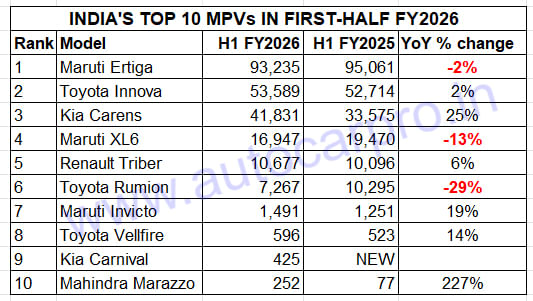 Top 10 MPVs in H1 FY2026: Ertiga and Innova Lead but Kia Carens Shines with 25% Growth