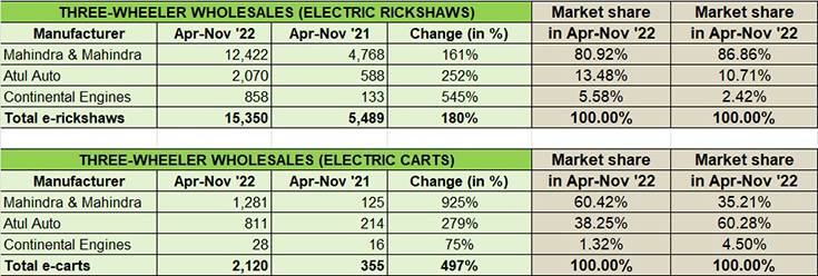 The electric three-wheeler market, along with electric two-wheelers, have been the growth aggregators in India’s EV industry. Proof of this can be seen in this segment’s performance in April-November 2022: a total of 17,470 units sold, which marks solid 179% growth (April-November 2021: 5,489). This performance sees it increase its share of the overall market to 5.89% from 3.90% a year ago.
