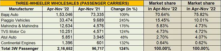 A macro look at SIAM’s overall wholesales data table reveals that the top three OEMs – Bajaj Auto, Piaggio and Mahindra – command 90% of the market: 267,296 units of the total 296,430 units sold. Bajaj Auto has a commanding 60% share of the three-wheeler market with 177,250 units, up 92%, in April-November 2022 albeit it has lost marginal market share (April-November 2021: 61.56%). No. 2 player Piaggio Vehicles, with 54,187 units, up 118%, has increased its share to 18.27% from 16.59% a year ago. Mahindra & Mahindra too has done well with 35,859 units, up 112%, and also grown market share to 12% from 11.26% a year ago.