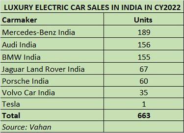 As per the Vahan Data for 2022, approximately 663 electric luxury cars valued at around US$ 100 million (Rs 824 crore) were registered at the luxury end of the market last year. What has emerged is a neck-and-neck race for supremacy between Mercedes-Benz, BMW and Audi with just 20-40 units separating the three German luxury car rivals (see data table below).