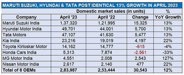 India’s passenger vehicle market leader with 137,320 units in April 2023 saw 13% year-on-year growth (April 2022: 121,995) while the month-on-month increase is 3.43% (March 2023: 132,763).