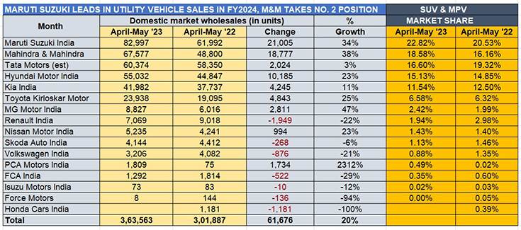 Maruti Suzuki India, which has been the UV market leader for the past two fiscals, has taken a early and strong lead by dispatching 82,997 units in April-May 2023. This constitutes robust 34% year-on-year growth (April-May 2022: 61,992 units) and has helped the company increase its UV share to 23% from 20.53% a year ago.