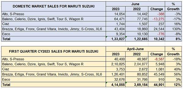 India’s passenger vehicle market leader clocked a total of 133,027 units in June 2023, up 8% (June 2022: 122,685 units). Month-on-month, this is a decline of 7.43% (May 2023: 143,708 units). While second-quarter (April-June 2023) sales of 414,055 units are a 12% increase over Q2 CY2022’s 369,154 units, they are down 13.66% on Q1 CY2023’s 427,578 units.