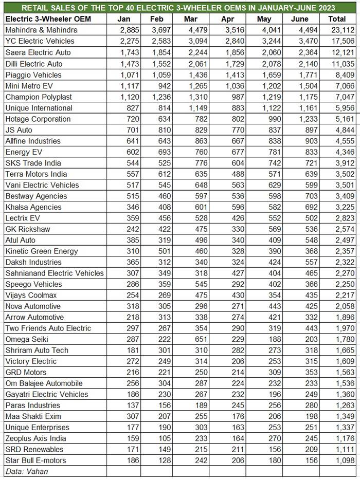 Of the nearly 450 players in the market, we have shortlisted the Top 40 OEMs in terms of sales and Mahindra Last Mile Mobility (MLMM), the market leader in FY2023 with over 35,000 units and a 9% share, maintains its top status with sale of 23,112 units in January-June. This total is already 66% of the company’s CY2022 sales of 35,013 units. June’s 4,494 units are likely its best-ever monthly sales yet. MLMM, which expanded manufacturing capacity in April with a new line for its Treo e-three-wheelers at the Haridwar plant, currently has six EVs on sale – the Treo, Treo Yaari and e-Alfa Mini for passenger transport and the Zor Grand, Treo Zor and the e-Alfa cargo for goods transport.