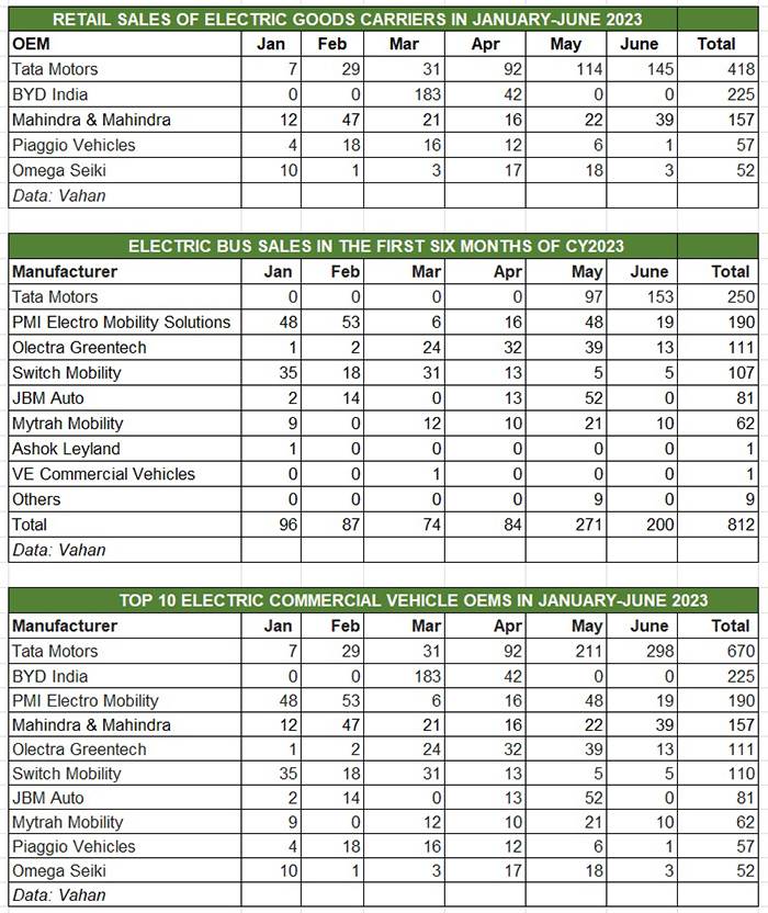 In the combined sales tally of goods carriers and buses, Tata Motors leads with 670 units, which makes for a strong 32% market share. It is followed by BYD India with 225 units and an 11% share. PMI Electro Mobility (190), Mahindra Last Mile Mobility (157), Olectra Greentech (111) and Switch Mobility (111) are other OEMs which have seen sales run into three figures.