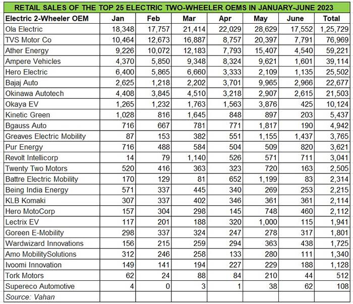 A close look at the six-month data reveals that of the total 135 OEMs in the market, the Top 10 EV makers, with sales of 391,218 units, have a 90% share of the total 434,914 units sold. Market leader Ola Electric has a stranglehold and a huge lead over its rivals. Its H1 2023 sales at 125,729 units it ha a commanding 29% market share and is ahead of TVS Motor Co, by 48,760 units. TVS sold a total of 76,969 iQube scooters, which gives it a 17.69% share, creditable given that it retails only a single product. In third position is Ather Energy with 59,221 units and a 13.61% share.