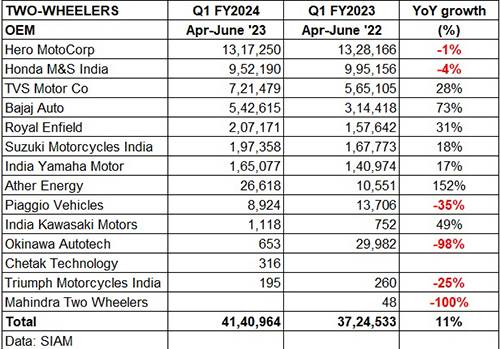 Market leader Hero MotoCorp dispatched 13,17,250 motorcycles and scooters, down 0.82% on year-ago sales of 13,28,166 units and with a 32% market share. Honda Motorcycle & Scooter India was also in negative territory with 9,52,190 units, down 4.31% (Q1 FY2023: 9,95,156).