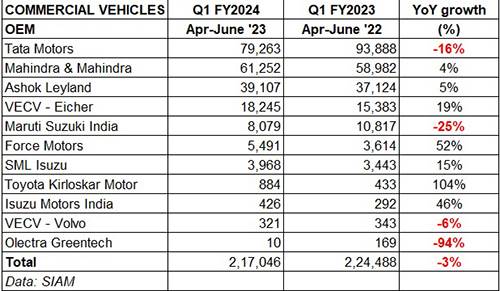 Tata Motors maintains its market leadership with 79,263 units sold but its Q1 FY2024 numbers are down 15.57% (Q1 FY2023: 93,888 units). Mahindra & Mahindra, thanks to demand for the Bolero pickup among other models, dispatched 61,252 units, a YoY increase of 3.84% (April-June 2022: 58,982 units). Ashok Leyland, with 39,107 units, reported an increase of 5% (April-June 2022: 37,124 units). VE Commercial Vehicles delivered a strong performance – 18,245 units, which is 18.60% better than the year-ago 15,383 units.