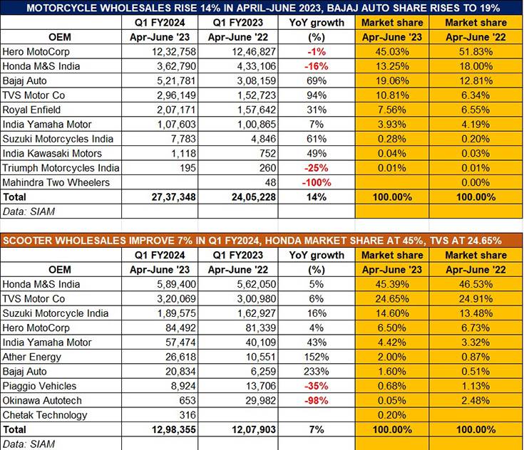 As per the wholesale numbers released by industry body SIAM for the first quarter of FY2024 (April-June 2023), a total of 41,40,964 scooters and motorcycles were dispatched by OEMs, which is an 11% year-on-year increase (Q1 FY2023: 37,24,533 units) .