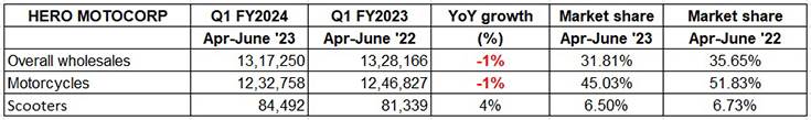 Overall two-wheeler market leader and also bike market leader Hero MotoCorp with sales of over 1.31 million units saw a 1% dip in YoY sales and its market share has reduced to 31.81% from 35.65% in Q1 FY2023. Tepid demand for commuter motorcycles, for which the company is the largest OEM, has meant that bike sales at 12,32,758 units were also down 1% YoY. In the scooter market, Hero is ranked fourth – it sold 84,492 units, up 4% YoY for a share of 6.50%, slightly down from the 6.73% it had a year ago.