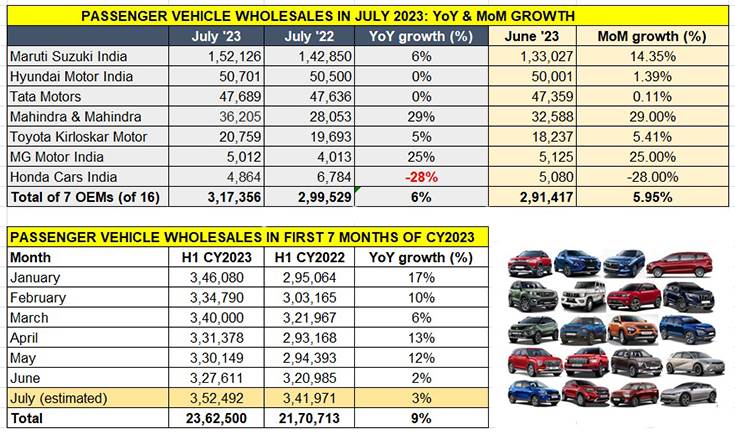 With seven of the 16 car, SUV and MPV manufacturers in India announcing their wholesale numbers for July 2023, it is amply clear that the 325,000-unit sales mark has been surpassed for the seventh month in a row. While the cumulative sales of these seven OEMs add up to 317,356 units, it is estimated that the remaining OEMs have added another 35,136 units. This delivers a total wholesales figure of 352,492 units, up (July 2022: 341,971 / +3.1%), making July 2023 the best month for the passenger vehicle industry in the calendar year to date and likely the best July too.