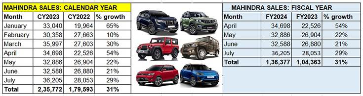 Mahindra & Mahindra has reported total wholesales of 36,205 units (all SUVs) in July 2023, which makes for strong 29% YoYgrowth (July 2022: 28,053 units). This is its highest-ever monthly sales of SUVs. The month-on-month growth in July 2023 is 11% (June 2023: 32,588 units).