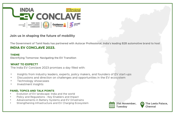 India’s leading automotive B2B brand – Autocar Professional – in association with the State Planning Commission – Tamil Nadu, and Guidance Tamil Nadu, is set to organise the India EV Conclave 2023. The mega on-ground event will be held in Chennai on November 21, 2023, and will pack technology showcases, policy talks and investment insights.