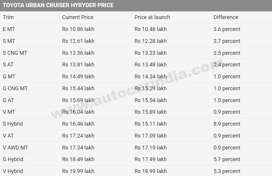 Launched at an attractive starting price of Rs 10.48 lakh for the petrol and Rs 15.11 lakh for the hybrid, Toyota certainly turned the spotlight towards the Hyryder, but with limited production, Toyota didn’t capitalise on the initial euphoria. Multiple price hikes thereafter have made the hybrid 5-9 percent pricier, while the petrol and CNG versions are 0.87-3.63 percent more expensive than their launch prices, as of today.