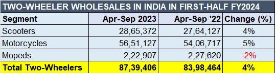 Combined scooter, bike and moped wholesales at 15,13,821 units in H1 FY2024 are up 17% over H1 FY2023’s 12,90,250 units.
