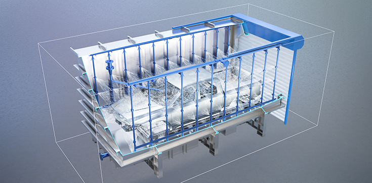 Instead of using large tanks, the innovative system design from Dürr envisages compact chambers, which are flooded or designed as spray chambers depending on the process step. At the process level, the body is loaded through a roller shutter door into the tunnel on the cross-transfer cars, which bring them to the respective process chambers. For future series systems, up to five of these crosstransfer cars are planned, which work in previously defined sections and bring the bodies to the chambers.