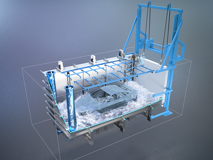 The first station in the painting process is pretreatment, where vehicle bodies coming through from the body shop are cleaned, degreased and prepared for subsequent coating. The second process step is electrocoating, which applies a primer to the body to protect against corrosion. Up to now, the RoDip rotational dip process has been used at Dürr for efficient immersion and draining processes. The EcoProWet PT pretreatment system is a completely new alternative to the established method.