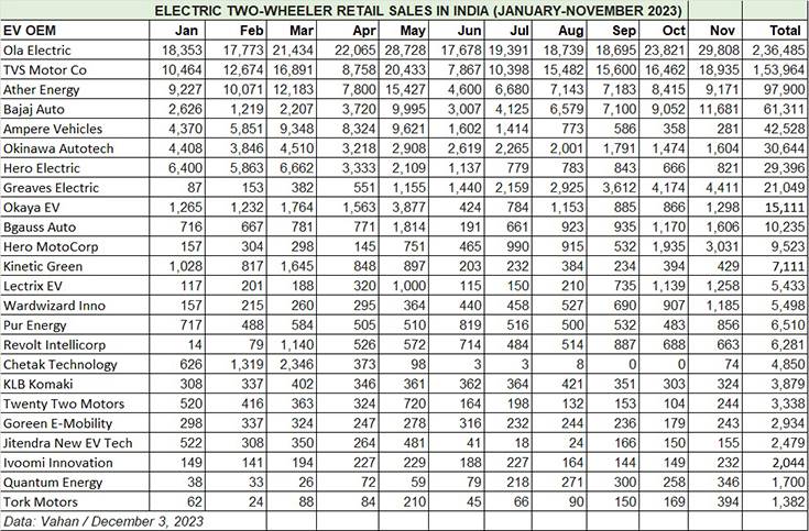 While this EV category has nearly 175 players, the bulk of the sales are cornered by the Top 10 OEMs (see sales table below), each with over 10,000 units. Of the Top 25 OEMs, these Top 10 account for 698,623 units in January-November 2023 or 90% of total sales. Only two players – Ola Electric (236,485 units) and TVS Motor Co (153,964 units) – have sales in excess of 100,000 units. Ather Energy (97,900 units) is just 2,100 units shy of the 100,000 mark and will surpass that in the first week of December.