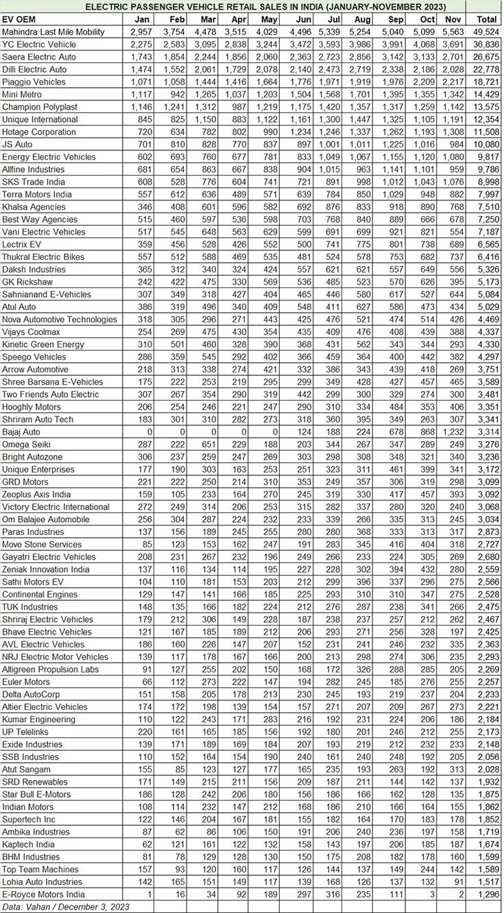 Cumulative EV industry sales, comprising the two- and three-wheeler, passenger vehicle and commercial vehicle sub-segments, for the first 11 months of 2023 are a record 13,87,114 units, which constitutes strong 50% year-on-year growth (January-November 2022: 924,111 units).