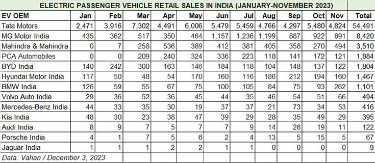 MG Motor India, with 8,420 units comprising the ZS EV and Comet EV, is the firm second-ranked ePV OEM. MG’s performance in the first 11 months of 2023 gives it a notable market share of 11 percent.