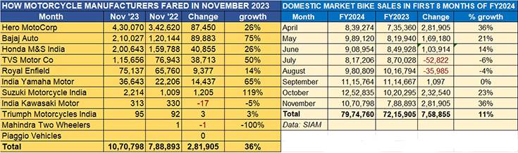 A close look at the wholesales data for both November and April-November 2023 reveals that the growth story for the motorcycle segment is here to stay. November was when the overall two-wheeler segment also clocked all-time-high retail sales of 2.24 million units, up 21% YoY. Thanks to increased agricultural income, the strong rural market sentiment is driving demand for fuel-efficient commuter bikes along with a good number of new product launches in the past three months and ramped-up production on the part of OEMs.