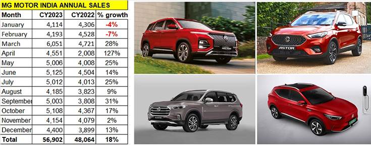 MG Motor India has announced its retail sales figure for calendar year 2023: 56,902 units. This constitutes an 18% year-on-year increase (CY2022: 48,064 units) and marks the fourth consecutive year of growth for the company.