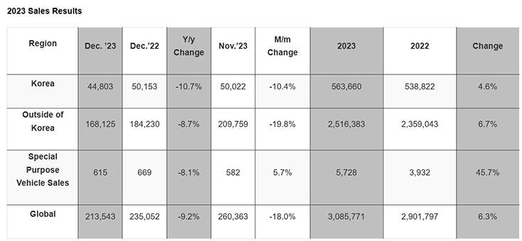 Kia Corporation has announced today global sales of 3,085,771 vehicles in 2023, posting a new annual global sales record. This represents a 6.3% increase compared with the 2,901,797 units sold in CY2022. Kia’s previous best yearly performance was recorded in 2014, with sales totalling 3,038,552 units. This included 2,573,352 units sold outside of Korea, and 465,200 vehicles in Korea.