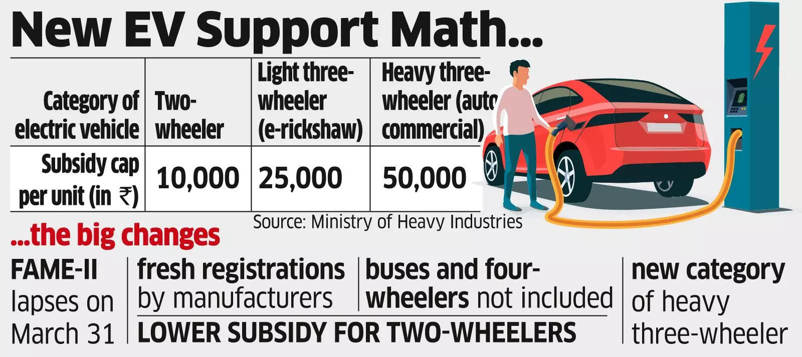 EMPS 2024 offers a subsidy on EVs of up to INR 10,000 per two-wheeler, INR 25,000 per light three-wheeler (like e-rickshaws), and INR 50,000 per heavy three-wheeler (like autos and commercial units).