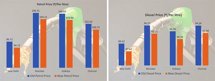 The much-awaited reduction in petrol and diesel prices will help reduce the hit on motorists’ wallets since mid-2022 and also reduce operating costs for over 58 lakh heavy goods vehicles running on diesel, six crore cars and 27 crore two-wheelers in India.