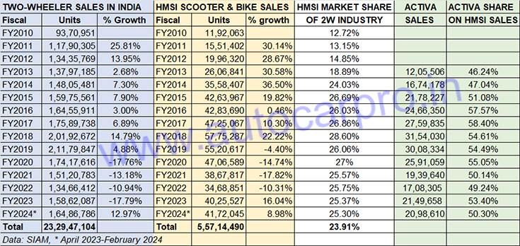 The comprehensive data table above reveals that of the 232 million two-wheelers sold in India since FY2010 till end-February 2024, HMSI accounts for 5,57,14,990 units (55.71 million units) or 24% of that, clearly establishing its status in the market. Honda recorded its best-ever fiscal sales in FY2018 – 5.77 million units, up 22% – which also meant that its contribution to India Two-Wheeler Inc was its highest at 28.60 percent. Not surprisingly, the Activa also registered its best-ever sales in FY2018 – 3.15 million units, accounting for 54% of HMSI’s total two-wheeler sales.