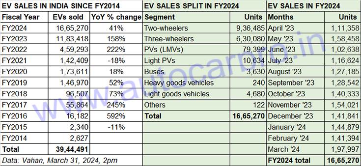 FY2024 has ended on a very strong note for the Indian electric vehicle (EV) industry, setting a new benchmark for sales across vehicle segments as also delivering the best-ever 12-month sales for the electric two-wheeler, three-wheeler and passenger vehicle sub-segments. At 1.66 million units retailed, FY2023 numbers are a handsome 41% year-on-year increase (FY2023: 1.18 EVs). And sales in March 2024 have marched to a new monthly high – over 197,000 units.