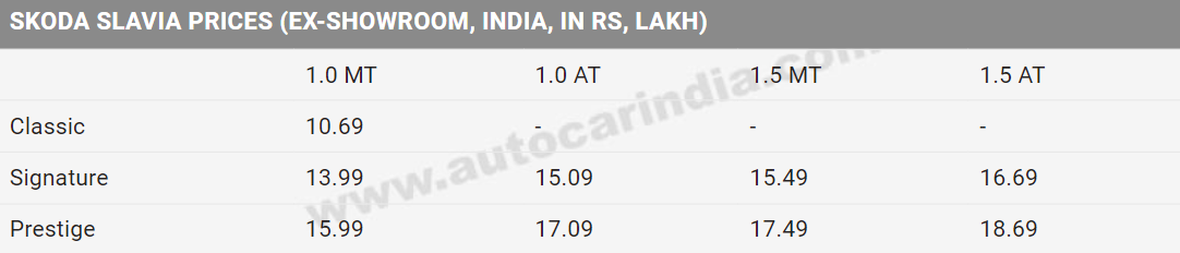 The Slavia Active variant, which was the entry point to the midsize sedan’s range, was priced at Rs 11.63 lakh. However, the new Slavia Classic trim brings the entry-level price down by Rs 94,000 to Rs 10.69 lakh. Meanwhile, even prices for the range-topping Slavia have reduced by a considerable amount. The new Prestige variant (Rs 15.99 lakh to Rs 18.69 lakh) undercuts the previous top-spec Style Elegance trim (Rs 17.53 lakh to Rs 18.93 lakh), although the latter was only available with the larger 1.5-litre turbo-petrol engine.