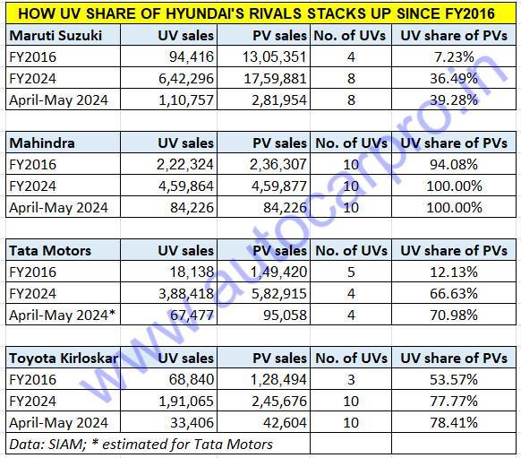 When it comes to SUV share of passenger vehicle sales, let’s also take a quick look at how Hyundai’s main rivals have fared in the same timeframe. A quick and comparative look at Hyundai Motor India’s four key rivals – Maruti Suzuki India, Mahindra & Mahindra, Tata Motors and Toyota Kirloskar Motor – reveals a similar trend when it comes to the increased share of utility vehicle sales to their overall passenger vehicle dispatches. This is also reflected in the increased number of UV models on offer.