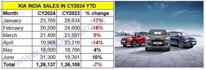 Kia India has announced dispatches of 21,300 vehicles in June 2024, which makes for a 10% year-on-year increase (June 2023: 19,391 units). While first-quarter FY2025 (April-June 2024) sales at are 60,768 units are down 10% YoY (Q1 FY2024: 61,373 units), the company’s cumulative sales for the first six months of CY2024 add up to 126,108 units, down 7% (January-June 2023: 136,108 units).