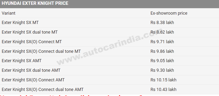 The Exter Knight edition is based on the SX & SX(O) Connect variants, and comes with exterior changes such as black painted side-sill garnish, red accents on the front bumper and tailgate, red brake calipers, black front and rear skid plates, black alloy wheels on the SX(O) Connect, black Hyundai and Exter badges, and a Knight emblem.