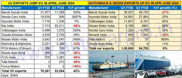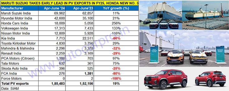 Maruti Suzuki, India’s No. 1 car and SUV exporter for the past three fiscals (FY2024, FY2023 and FY2022) has taken an early lead in overseas shipments of made-in-India passenger vehicles. As per export data released by industry body SIAM, a total of 180,483 units were exported in April-June 2024, up 19% YoY (Q1 FY2024: 152,156 units).