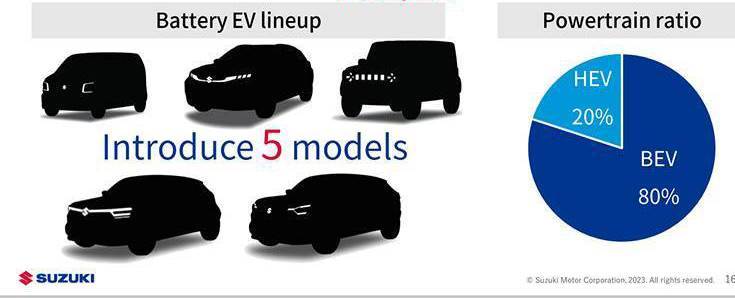 Lean-battery BEVs and HEVs: In early 2023, Suzuki had outlined an ambitious growth strategy which includes a £3 billion investment in battery development, introduction of five new electric cars from 2024 onwards and a pledge to achieve carbon neutrality in Europe by 2050.