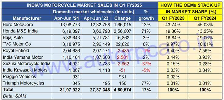 Bajaj Auto, ranked third on the motorcycle OEM ladder-board, dispatched 538,643 units in Q1, just 3% more than it did a year ago. In the entry-level 100-110cc segment, its sales at 125,423 units were down 9 percent. Demand in the segment above (125cc) was also down – the 226,041 units constitute a decline of 5.67% YoY. Things were better though in the 125-150cc category with 83,264 units, up 58 percent albeit the 65,135 units in the 150-200cc category saw a more tepid increase of 1.43 percent. The 200-250cc category saw Bajaj sell 26,085 units, up 22% YoY. Where Bajaj has hit a sixer is in the 350-500cc category – the 12,695 units emanating from the Dominar, Pulsar, Husqvarna, KTM and Triumph brands are a stellar 135% YoY increase (Q1 FY2024: 5,387 units). This mixed bag kind of performance sees Bajaj Auto’s Q1 FY2025 market share drop to 17% from 19% a year ago.