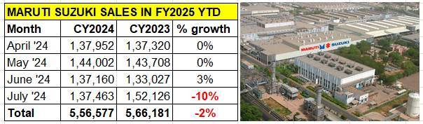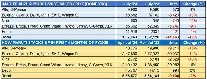 Market leader and PV industry bellwether Maruti Suzuki India has reported a 10% sales decline in July 2024 – 137,463 units, which are just 303 units more than in June 2024. This performance comes on the back of tepid sales in the first quarter of FY2025 as seen in the four-month wholesales data table below. As it has been for quite some time now, sustained demand for most of its SUVs and MPVs has saved the blushes for the company. However, in July, dispatches of its seven-model utility vehicle portfolio were also down.