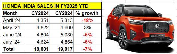 Honda Cars India, which retails the Amaze and City sedans along with the Elevate midsize SUV, dispatched 4,624 units in July, down 5% YoY, while its April-July 2024 tally at 18,601 units is also down, by 7 percent. In fact, the Japanese carmaker has exported 20,719 units in the first four months of FY2024, 2,118 units more than its domestic market wholesales.