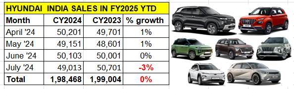 Hyundai Motor India has reported dispatches of 49,013 units in July 2024, which constitutes a YoY decline of 3% (June 2023: 50,701 units). This is the second month in the ongoing fiscal year that monthly sales have gone a tad below the 50,000 mark.