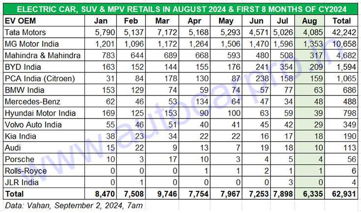Retail sales demand for electric passenger cars, SUVs and MPVs have fallen to their lowest level in the calendar year to date in August 2024. The 6,335 units bought and delivered to customers last month are down 10% year on year (August 2023: 7,012 units). Month on month, the August 2024 sales decline is even sharper – 19% – versus July 2024’s 7,898 units. This data is as per retail sales data published on the Vahan website (September 2, 7am).