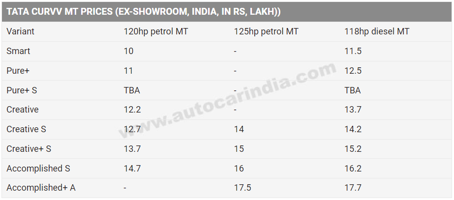 Do note that Tata has yet to reveal the complete price list for the Curvv as prices for all the automatic variants have yet to be announced. For now, we know that the entry-level petrol-DCT version starts at Rs 12.5 lakh, while the entry-level diesel-DCT starts at Rs 14 lakh. For the 125hp turbo-petrol engine with the dual-clutch auto, prices start at Rs 16.4 lakh.