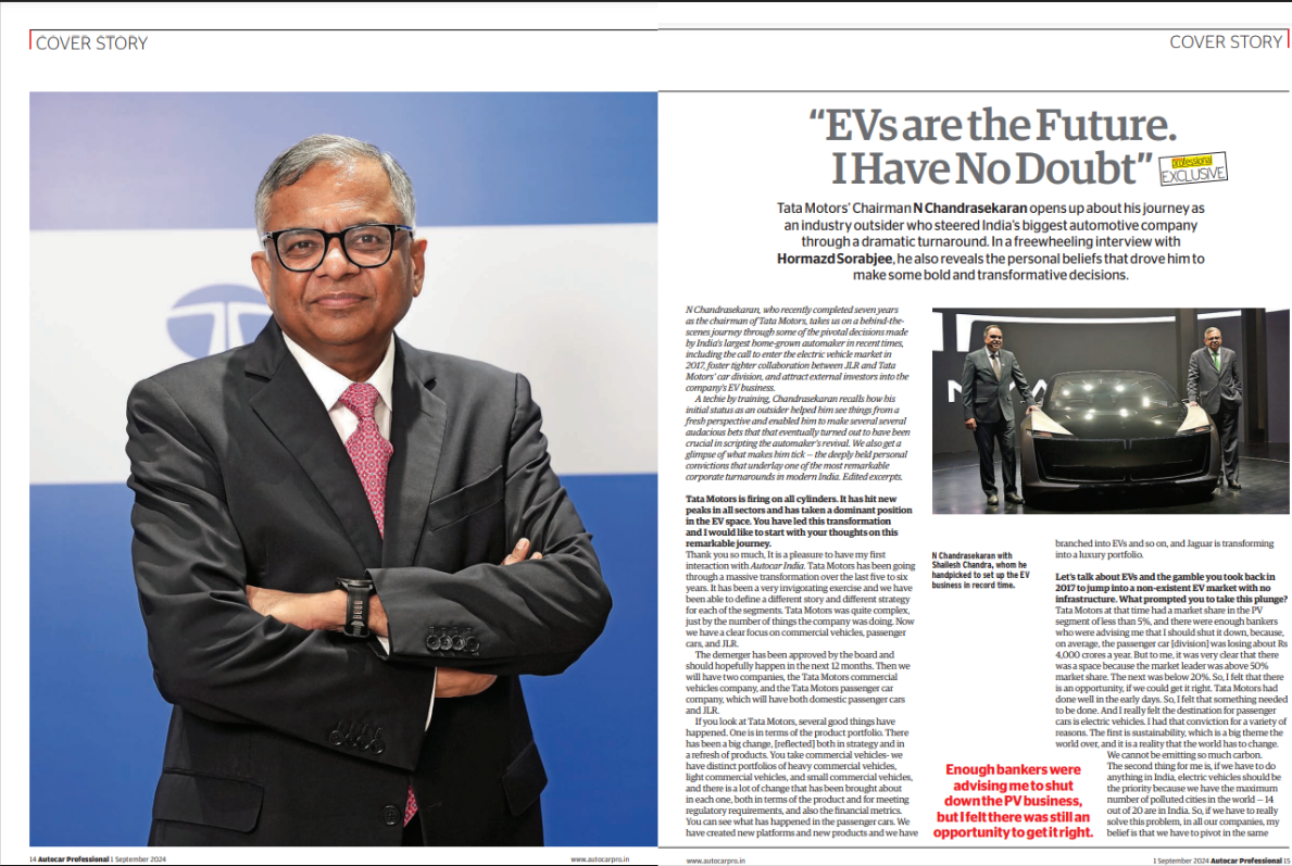 The captain of this extraordinary journey has been chairman Natarajan Chandrasekaran, who recounts his experiences, and vision, in a one-of-its-kind interview with Hormazd Sorabjee, Editor of Autocar India.