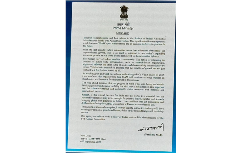 Prime Minister Narendra Modi shared a written message with the members of Society of Indian Automobile Manufacturers (SIAM) ahead of their 64th annual convention, stating that the 64th conclave was a significant milestone in celebrating SIAM.
