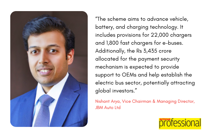 Nishant Arya, Vice Chairman & Managing Director, JBM Auto Ltd., stated that new scheme scheme is holistic in nature and shall herald a transformative growth in the EV sector towards the government’s mission of decarbonisation, zero emission and clean mobility.
