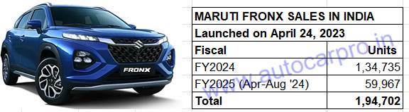 In the first 5 months of FY2025, the Fronx has sold 59,967 units (up 15% YoY), which translates into monthly dispatches of 11,993 units or nearly 400 units a day. The 200,000 milestone would have been achieved in the first fortnight of September.