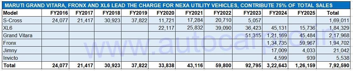 Nexa currently has eight models on sale – three passenger vehicles (Baleno and Ignis hatchbacks, Ciaz sedan) and five UVs (XL6, Grand Vitara, Fronx, Jimny SUVs and Invicto MPV). The S-Cross SUV, the first Nexa model launched in FY2016, was discontinued in August 2022.