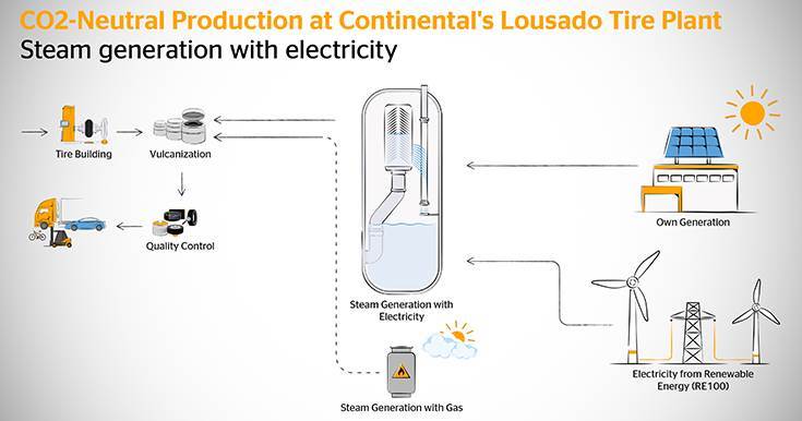 All Continental tyre plants are working on individual and company-wide solutions to achieve climate-neutral production by 2040 at the latest. This year, Continental took an important step toward this goal at its tyre plant in Lousado, Portugal. Here, the company can produce tyres carbon-neutrally, which has been made possible with steam generated by an electrically powered boiler. Continental generates the steam using both in-house produced solar power and renewable energy from the grid.